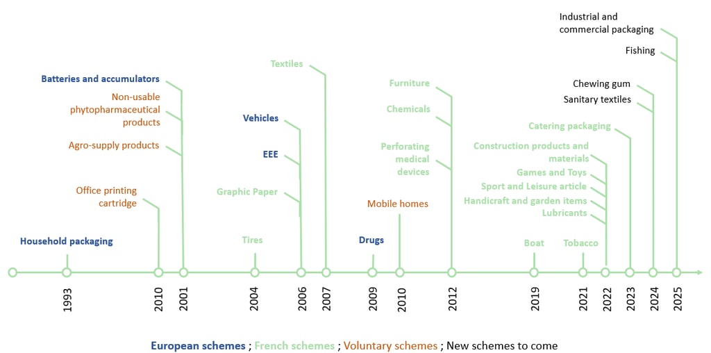 The principle of EPR has been enshrined in French law since 1975. The decree of April 1, 1992 on household packaging launched the implementation of the first EPR sector in France. Subsequently, it was extended to numerous sectors such as batteries and accumulators, graphic paper, electrical and electronic equipment (WEEE), furniture, etc.